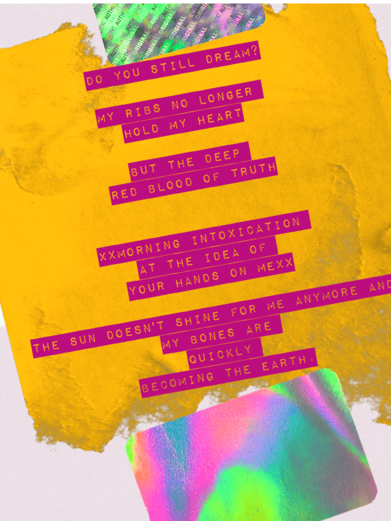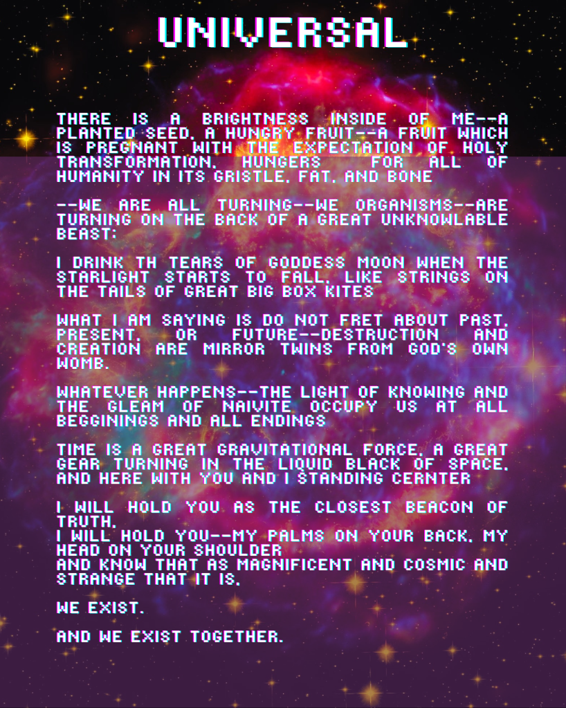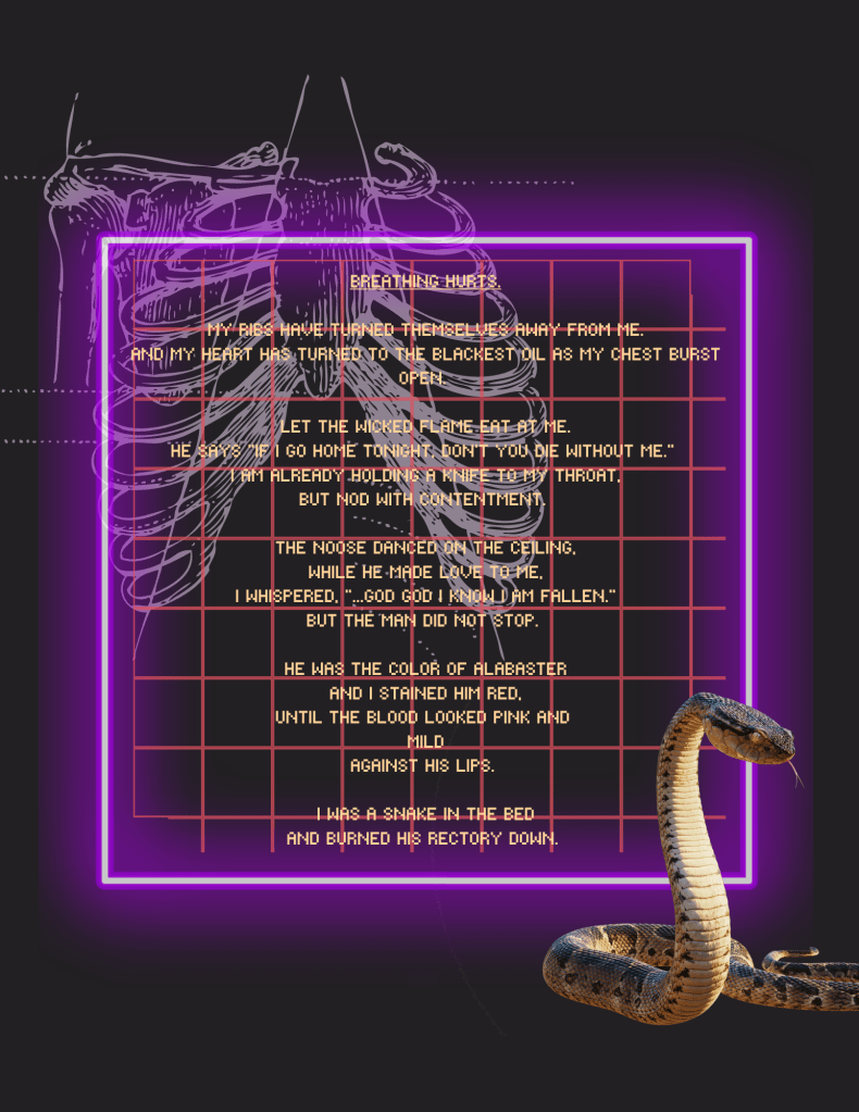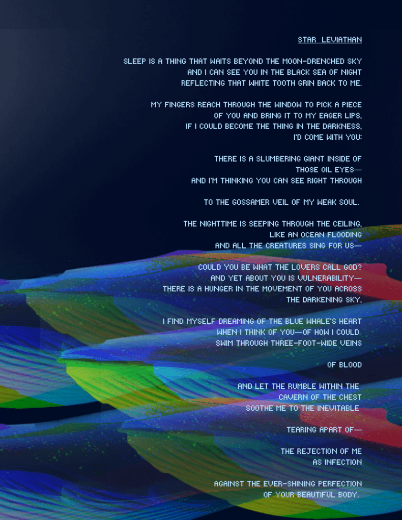 I have included this one in the VISPO GALLERY because it blurs the lines–poems and art tell a story and there is a captured moment here that smudges the lines between either.Star Leviathan–I love this poem–it’s about loving something or someone much bigger than you and the overwhelming feeling of vulnerability in that.Breathing Hurts–A poem about violence, complacency, and disbelief.
